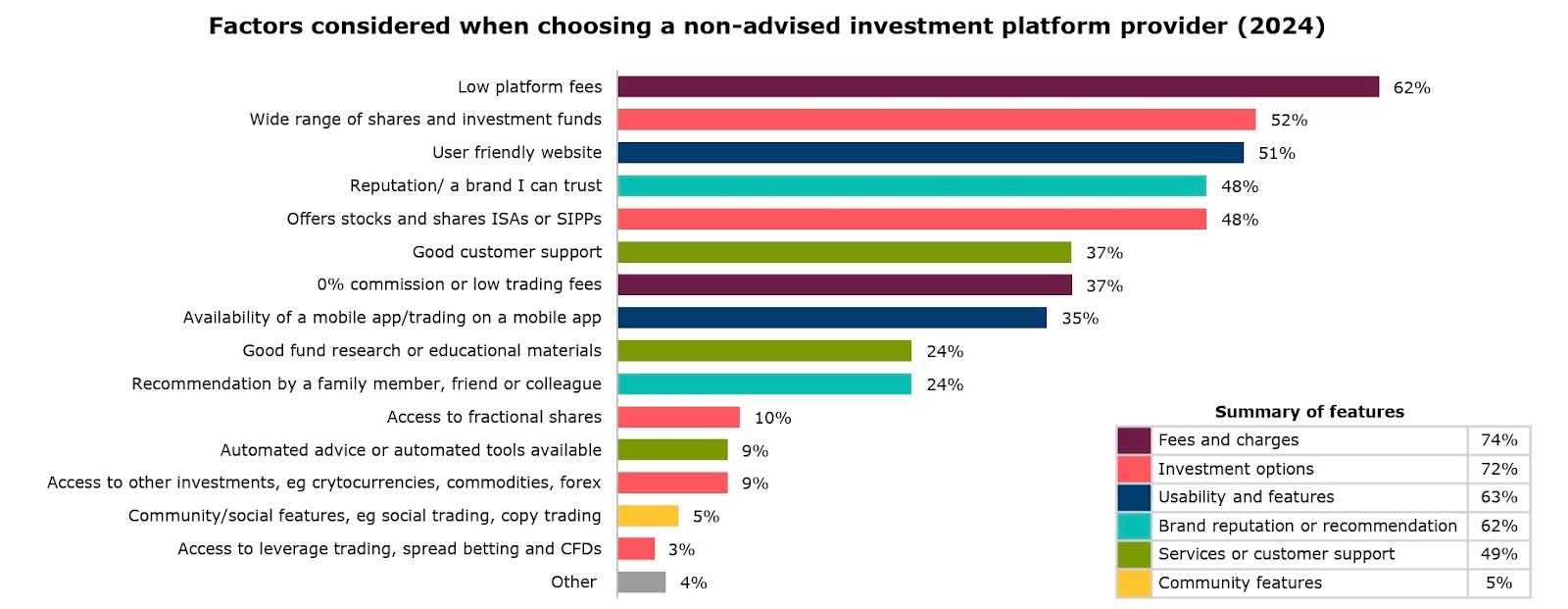 The financial lives survey shows some of the factors considered when choosing a non-advised investment platform provider, including low platform fees, user-friendly website, good customer support, brand reputation, good educational materials and community/social features.